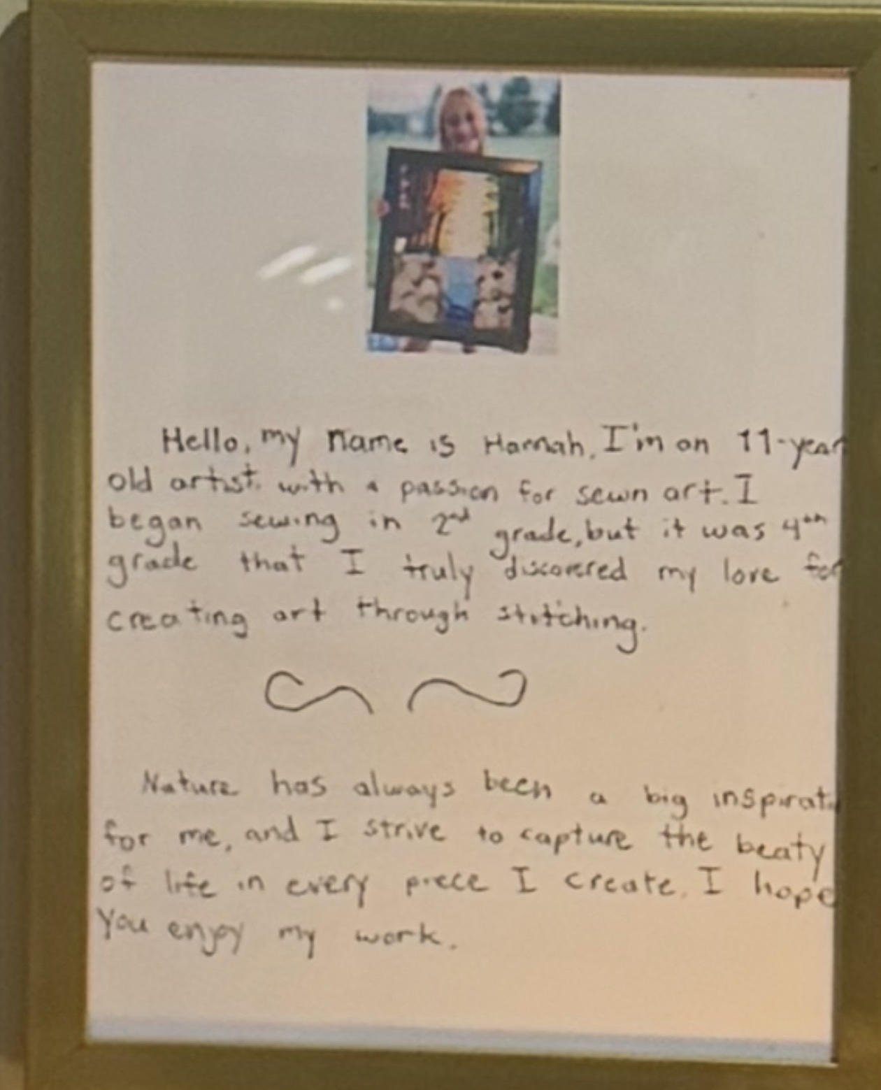 Hello, My name is Hannah. I’m an 11-year old artist with a passion for sewn art. I began sewing in 2nd grade, but it was 4th grade that I truly discovered my love for creating art through stitching.